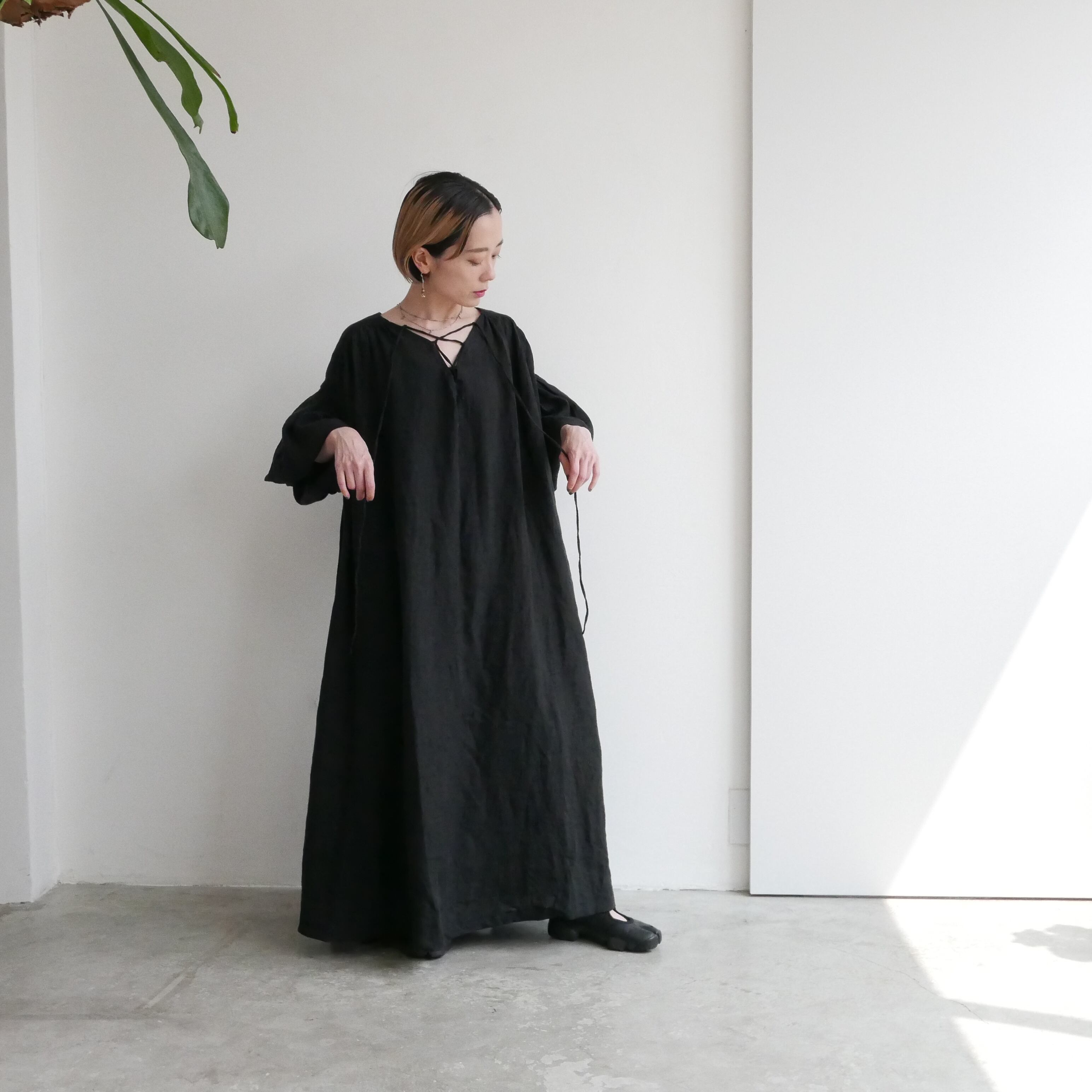クロスに編み上げられた胸元とバルーンなお袖が特徴のワンピース、シンプルに見えますが着ると存在感を感じます。