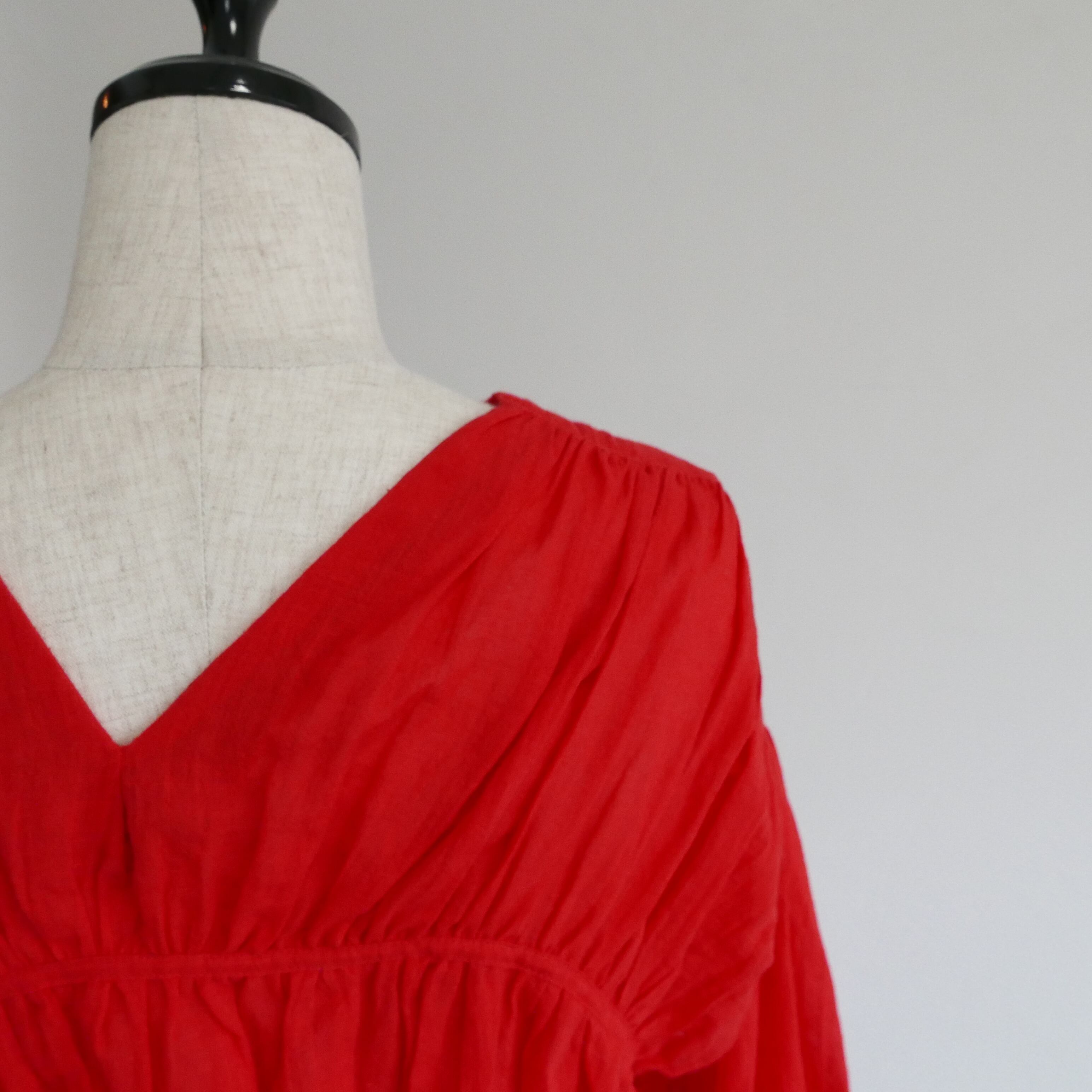 ギャザーをたっぷり入れバックの襟はあえてVネックの仕立てに。