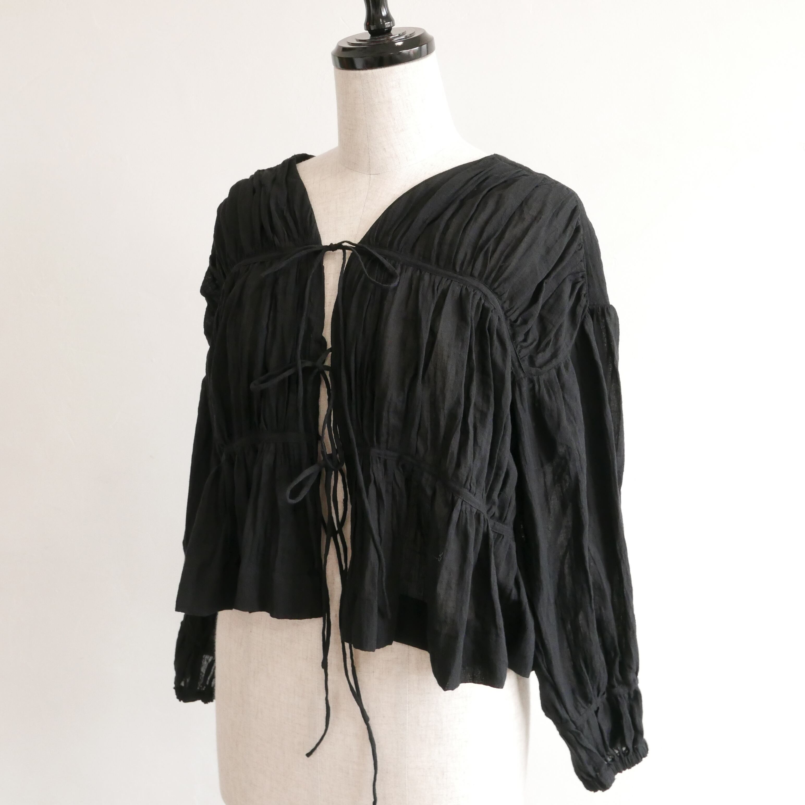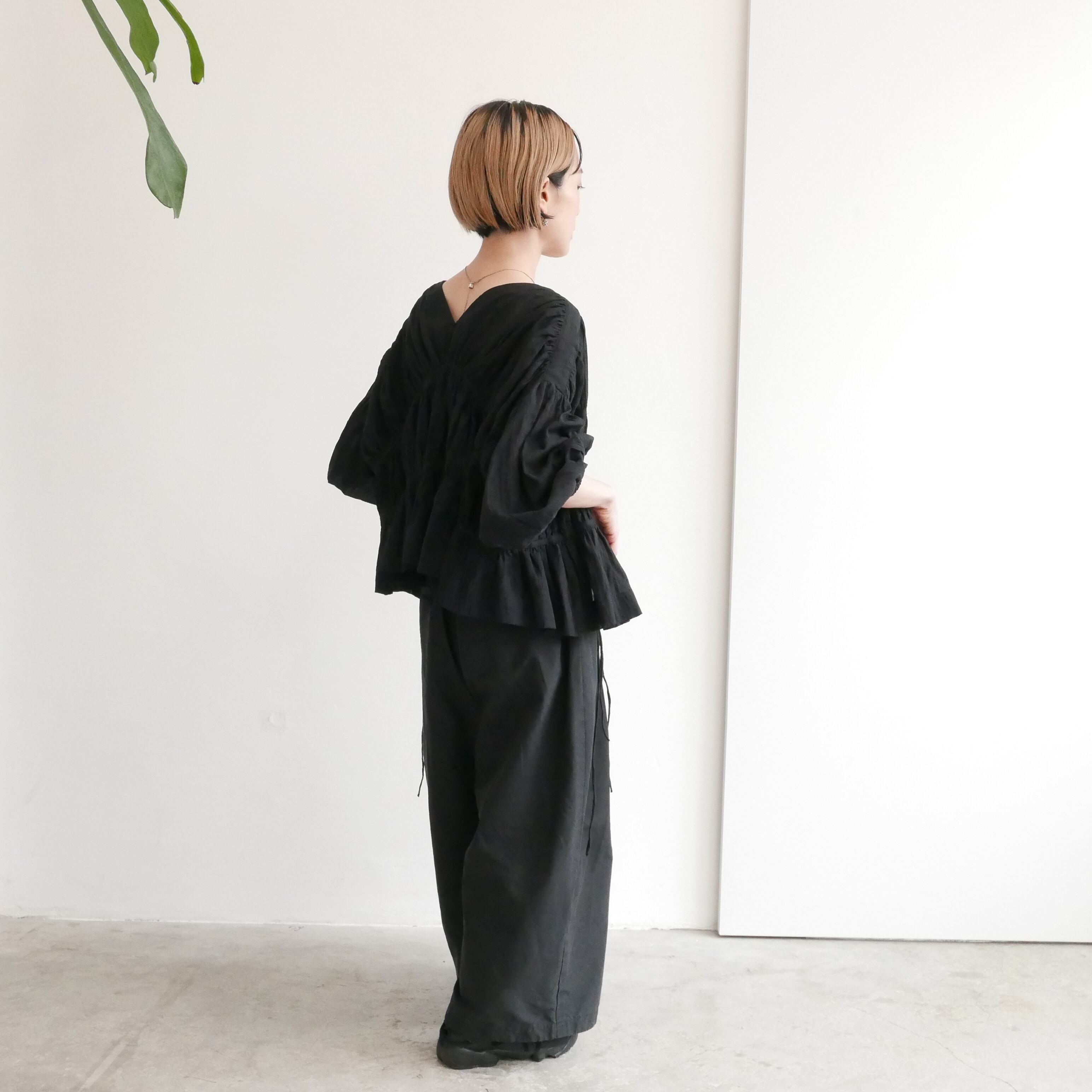 ギャザーをたっぷり入れバックの襟はあえてVネックの仕立てに。